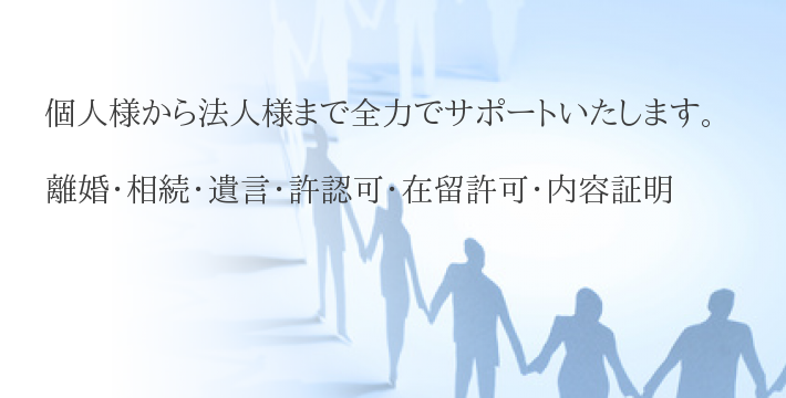 当事務所は主に茨城県及び千葉県(東葛エリア)を中心に、離婚・相続・遺言などの民事業務、各種許認可申請、在留許可・帰化申請などの国際業務、内容証明・契約書作成を主な業務としている行政書士事務所でございます。